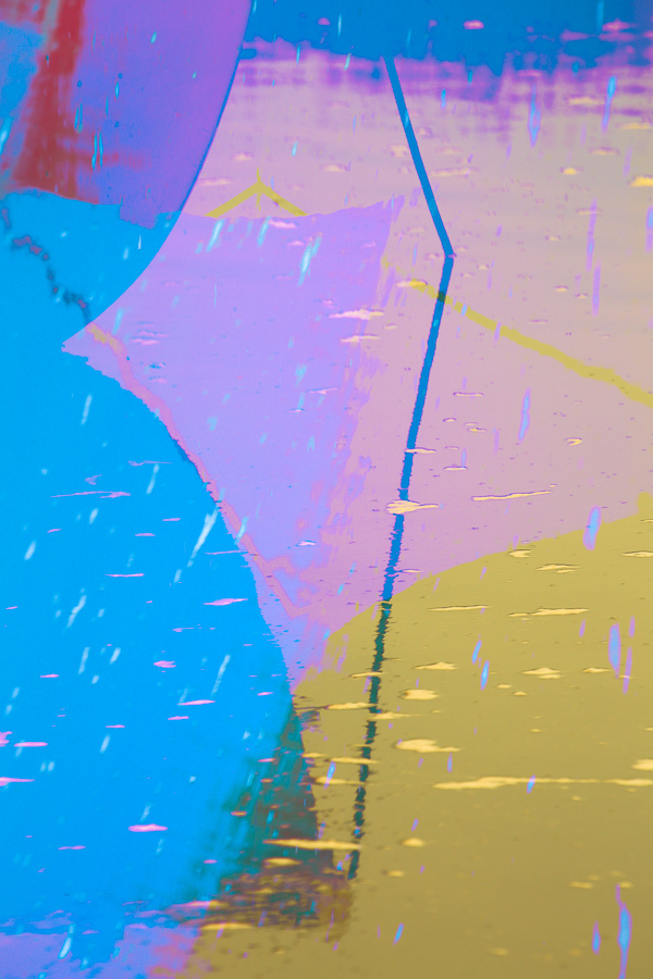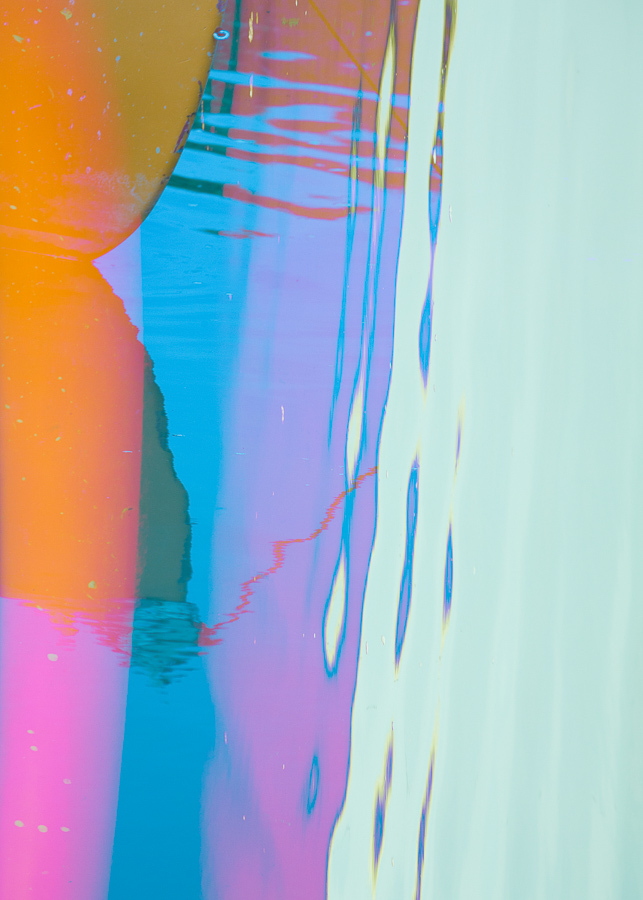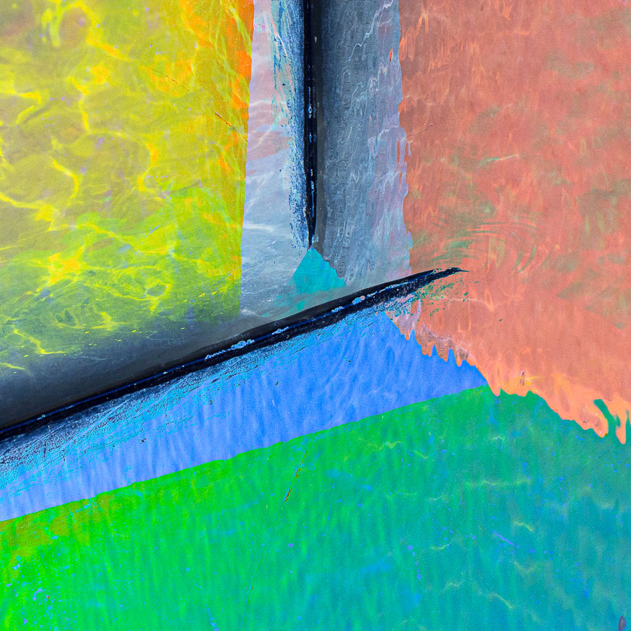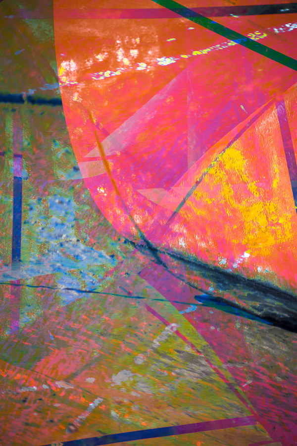 The solid, permanent shape of the boat contrasts with ephemeral waves, ripples and mud patterns, paint scratches, shadows and reflections.