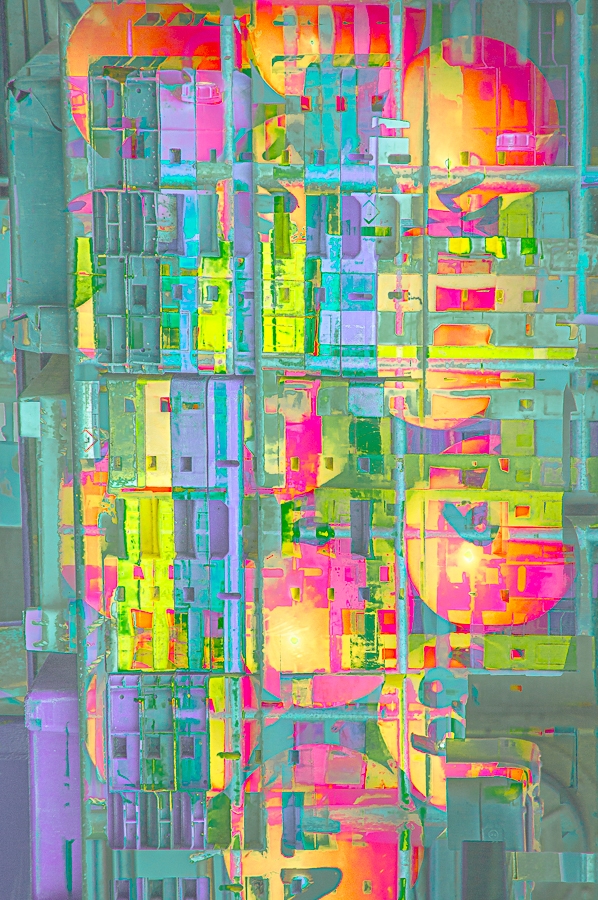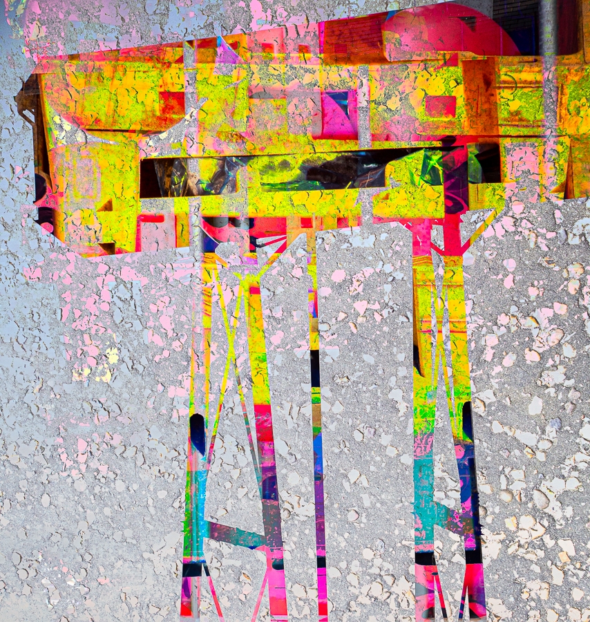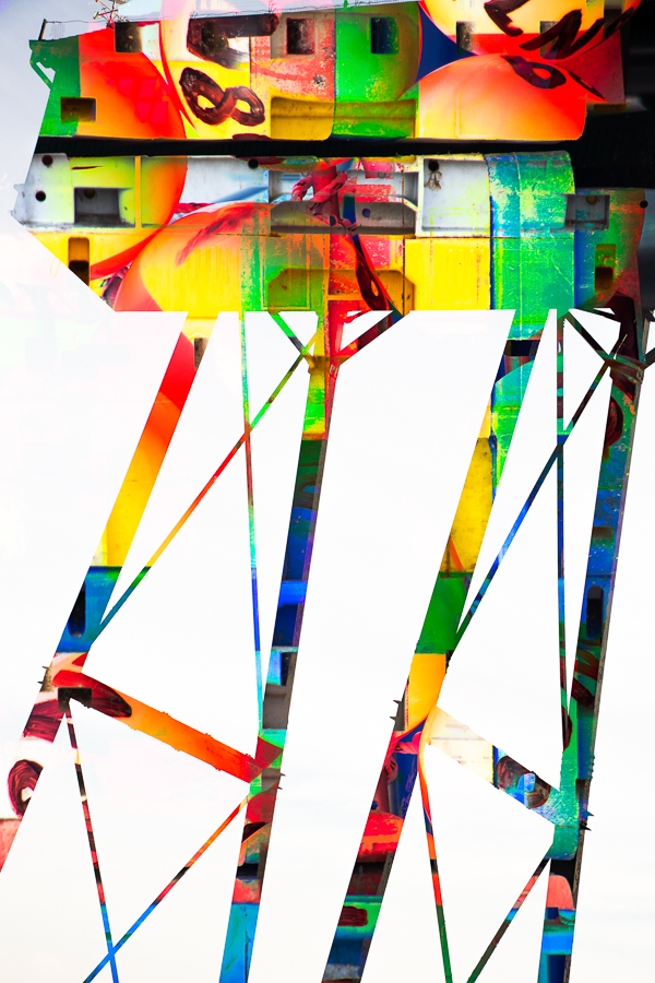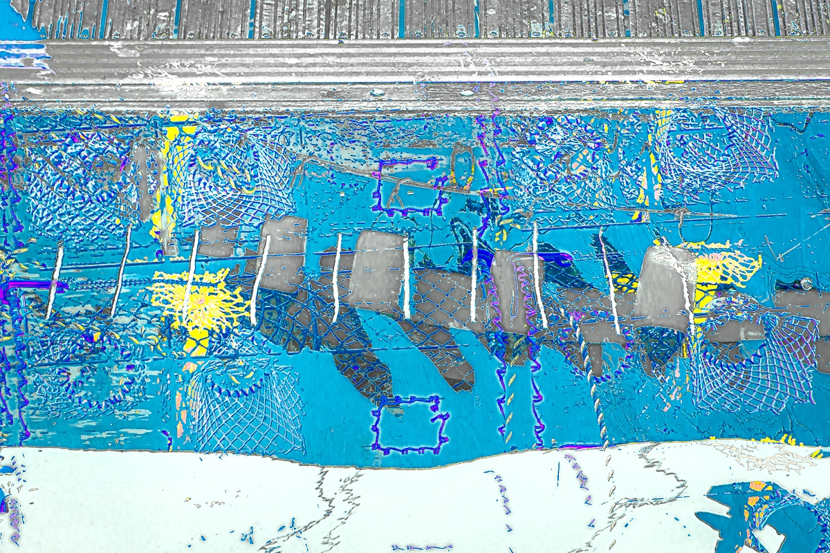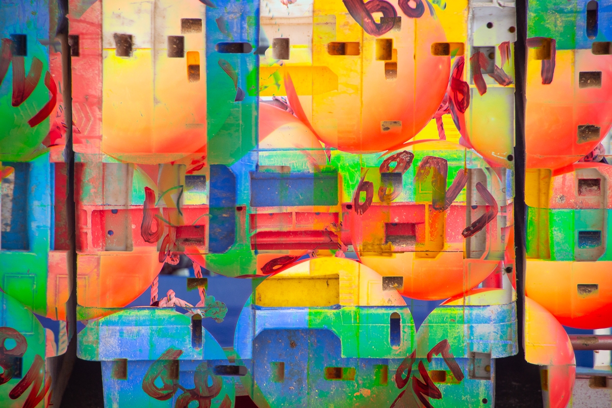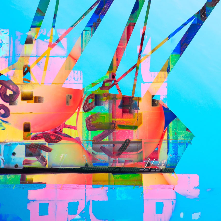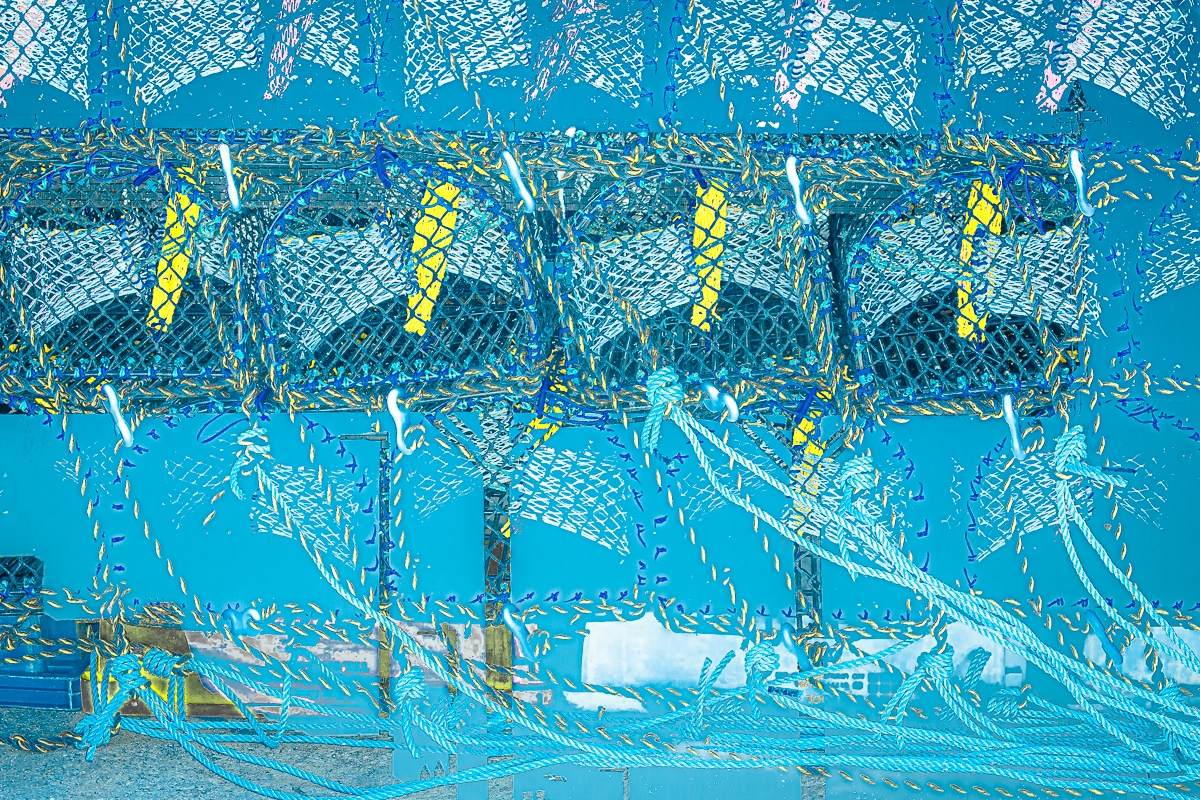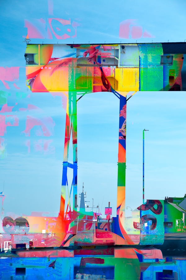 In my new and exciting vision of Wells you will see colour, silhouettes, collages, shapes and textures created from the multi-coloured fish crates, the neat stacks of lobster pots, the buoys and fenders, even the quayside concrete; and above all the shapes, legs and silhouettes of the gantry. Through my vivid colour palette and strong graphic images combining iconic and mundane subjects I hope you may catch a glimpse of Pop Art in the 21st century.